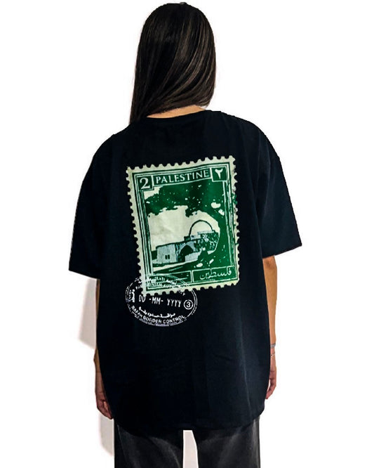 Oversized Fit Palestine Green Postage Stamp T-Shirt -Black